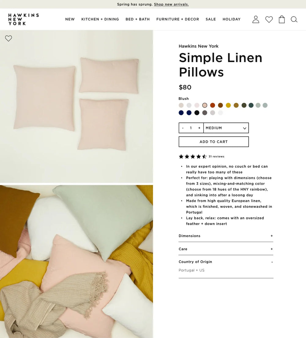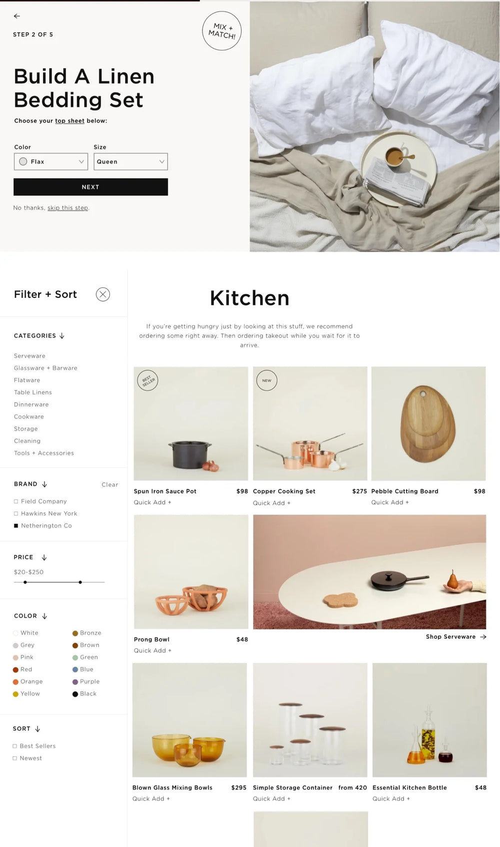 We worked closely with Hawkins New York to design and build a beautiful digital storefront with robust functionality, including quick shop, exploded variants, and the integration of editorial content on the product pages. Most importantly, we included a custom-built product bundler to allow customers to mix and match their signature bedding.
